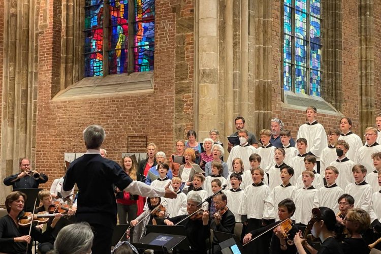 Gleich im Anschluss versammelten sich Eltern und Gemeindemitglieder zu einem großen, spontanen Chor in der Kirche, um mit Knabenchor und Orchester den Eingangschor der schon im Gottesdienst erklungenen Bach-Kantate noch einmal gemeinsam zu singen.